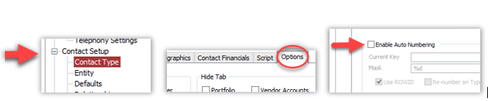 For contacts, you can enable auto numbering in global setup under Contact Setup>Contact Type. Go the the Options tab then click on Enable Auto Numbering